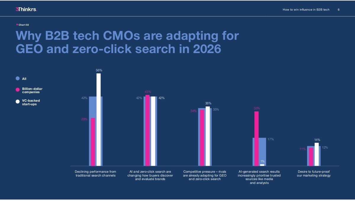 Примерно так себя чувствуют сегодня многие директора по маркетингу. Мир только что сменил правила. Согласно свежему исследованию «A CMO’s Marketing and Communications Playbook for 2026», трафик на B2B-сайтах упал на 34% за год, классический поиск стремительно сдает позиции, а две трети (62%) маркетинг-директоров признаются: они не готовы конкурировать с гибкими, AI-ориентированными игроками.