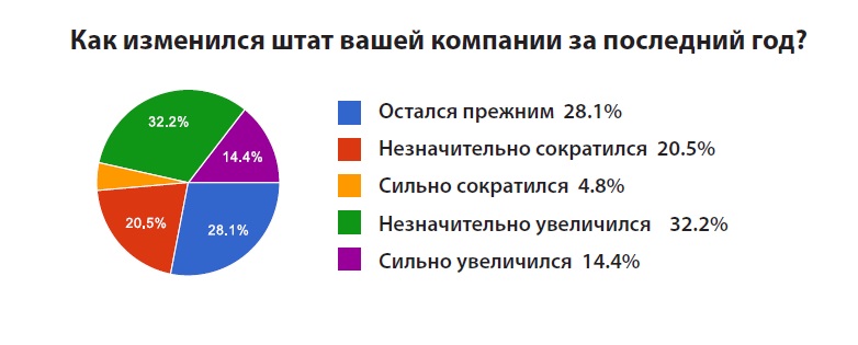 Итоги опроса показали, что, несмотря на спад в развитии многих отраслей бизнеса, штат более чем в половине компаний за последний год незначительно увеличился или остался на прежнем уровне.